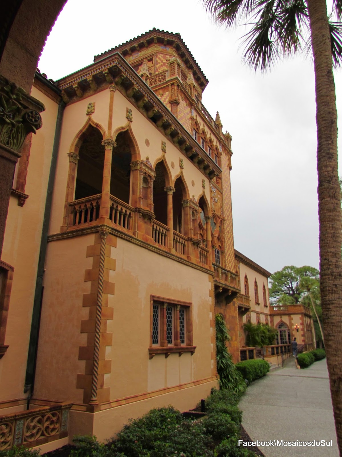Chovia muito quando visitamos, infelizmente, o que prejudicou nosso passeio pelos jardins. Com o mais antigo roseiral da Florida, era orgulho da Sra. Ringling, que o criou com mais de 1200 roseiras. Em sua homenagem uma variedade leva seu nome, Mable. Apesar da chuva não deixamos de visitar a bela mansão chamada de Ca'd'Zan (ou "Casa de John"), residência de inverno dos Ringlins, construída entre 1924 e 1926. Em estilo Veneziano Gótico, foi inspirada no Palácio dos Doges de Veneza e no minarete da Torre de Giralda, em Sevilha. Apaixonados pela Itália, o casal elegeu o local como destino de férias utilizado para receber e entreter seus muitos convidados.